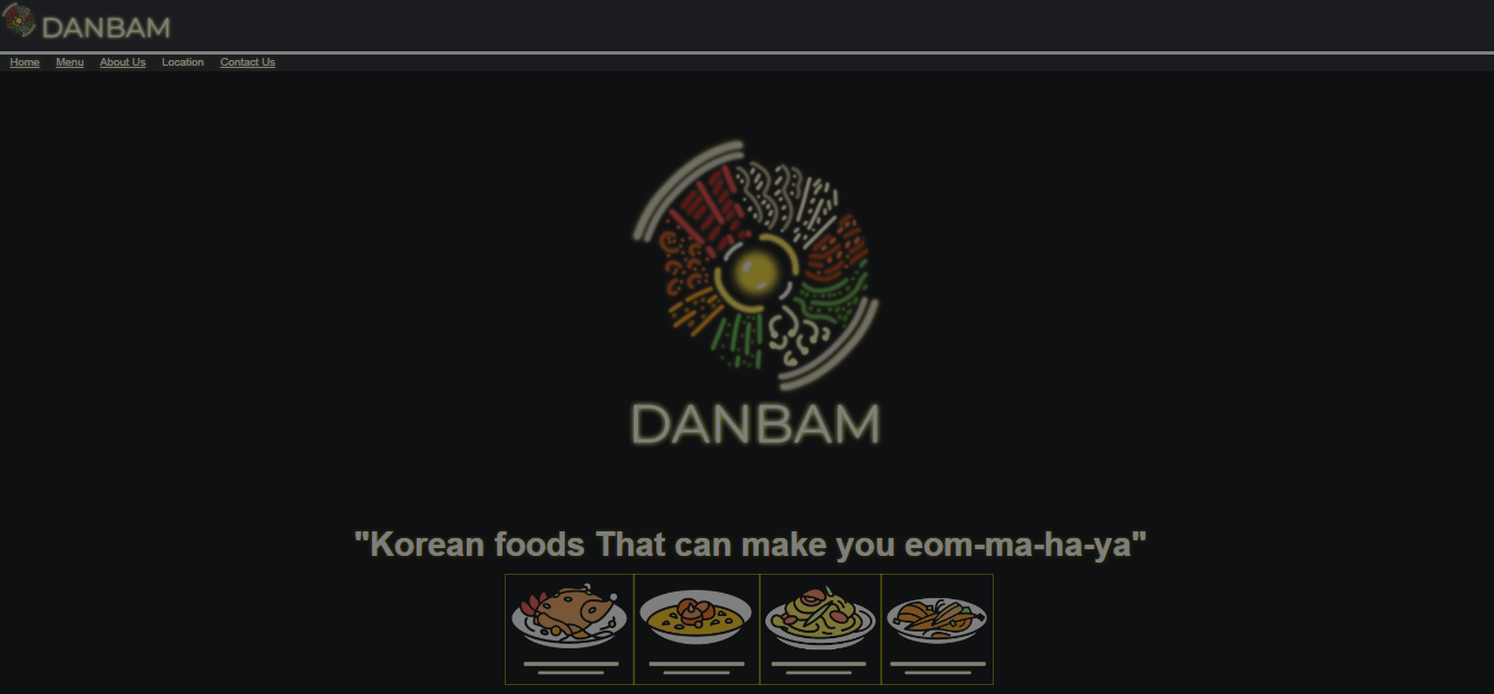 During my time as a college student, my teammate and I were tasked to create a website for a fictional restaurant named Danbam. This app provides several features such as an "About Us" page to learn the background of the restaurant, a "Menu" page where users can see some of the restaurant's best meals and drinks, a "Location" page to let the users know the locations of DanBam, and a "Contact Us" page if the user has any questions about the restaurant.